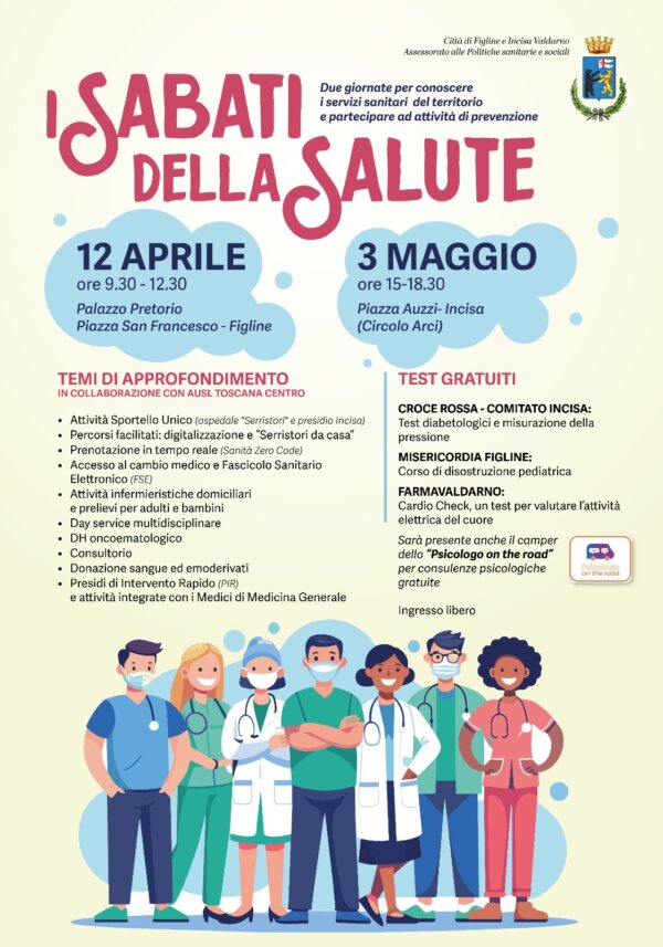 L’appuntamento è dalle 15 alle 18:30 ed è a cura dell’Assessorato alle Politiche sanitarie e sociali del Comune, in collaborazione con Ausl Toscana Centro, CRI, Misericordia e FarmaValdarno. Presente anche il camper dello Psicologo on the road
