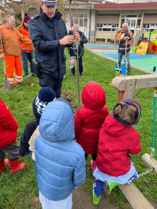 Gli alberi (susini, peri, salici e palle di neve) sono stati donati dai Carabinieri Forestali ai piccoli della scuola, che hanno “affiancato” gli operai nella piantumazione