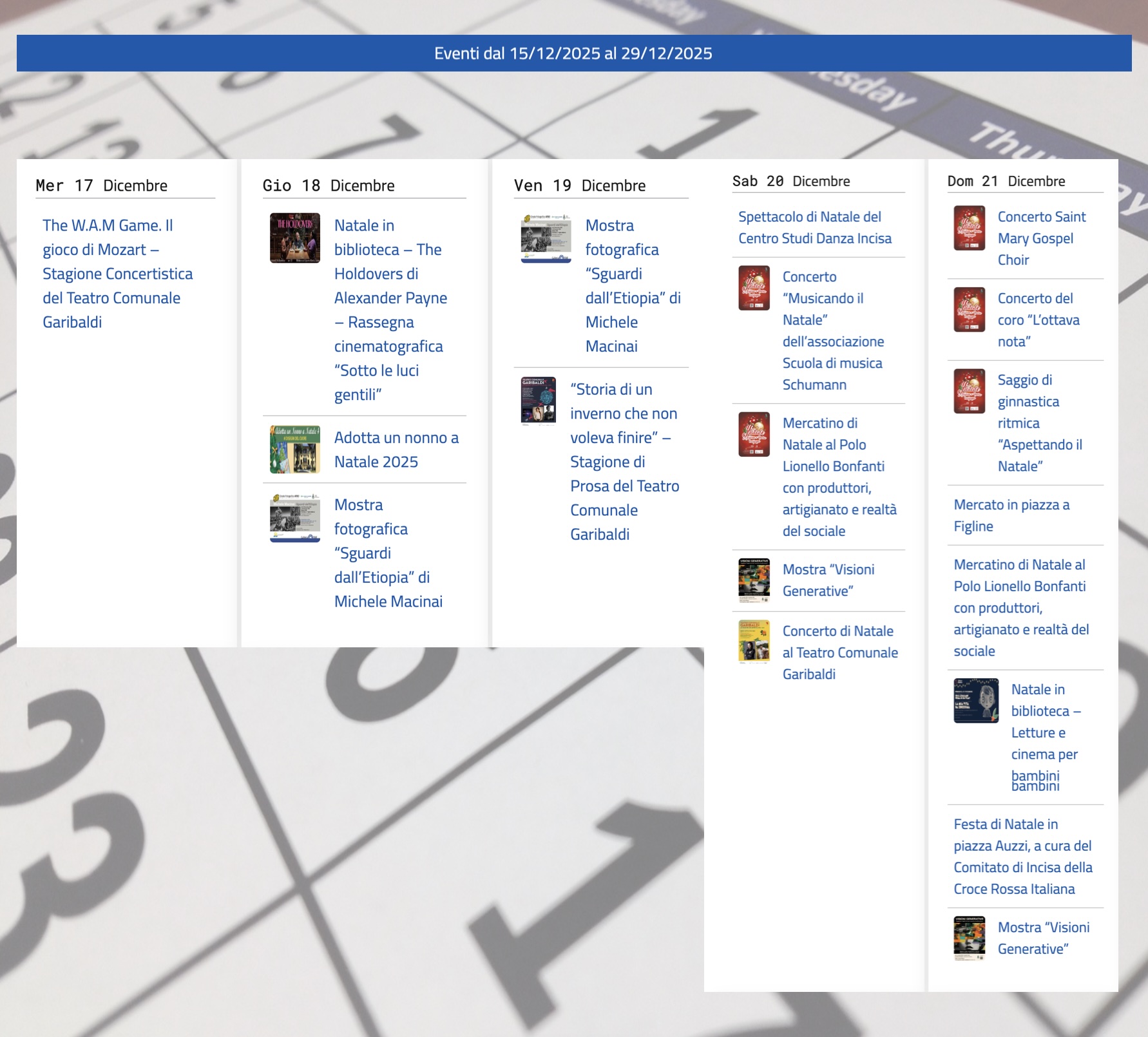 Musica dal vivo, mercatini di Natale, rassegne cinematografiche, iniziative dedicate a bambini e ragazzi e molto altro ancora. Si apre una nuova settimana ricca di eventi a Figline e Incisa Valdarno, con proposte culturali e di intrattenimento, promosse dal Comune o realizzate grazie al suo sostegno.