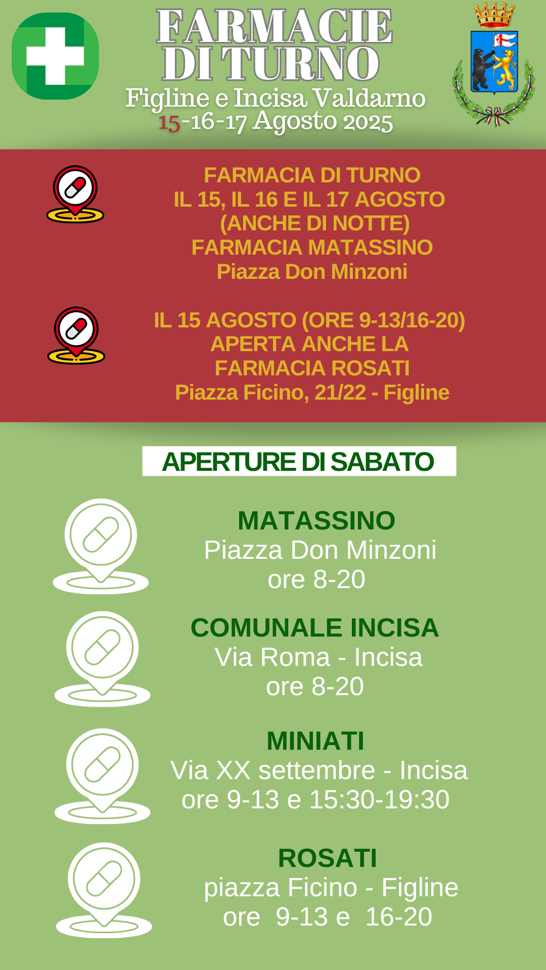 Ecco di seguito le farmacie di turno aperte nei giorni 15 (Ferragosto), 16 e 17 agosto a Figline e Incisa Valdarno.