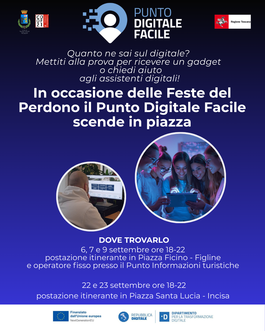 In occasione delle Feste del Perdono, il Punto digitale facile del Comune di Figline e Incisa Valdarno scenderà in piazza Marsilio Ficino e piazza Santa Lucia. Un modo per andare incontro alle esigenze dei cittadini, che potranno unire l’utile e il dilettevole, approfittando della presenza degli operatori per richiedere supporto e assistenza digitale oppure per partecipare ad un Quiz, per testare le proprie competenze informatiche e ritirare un gadget.