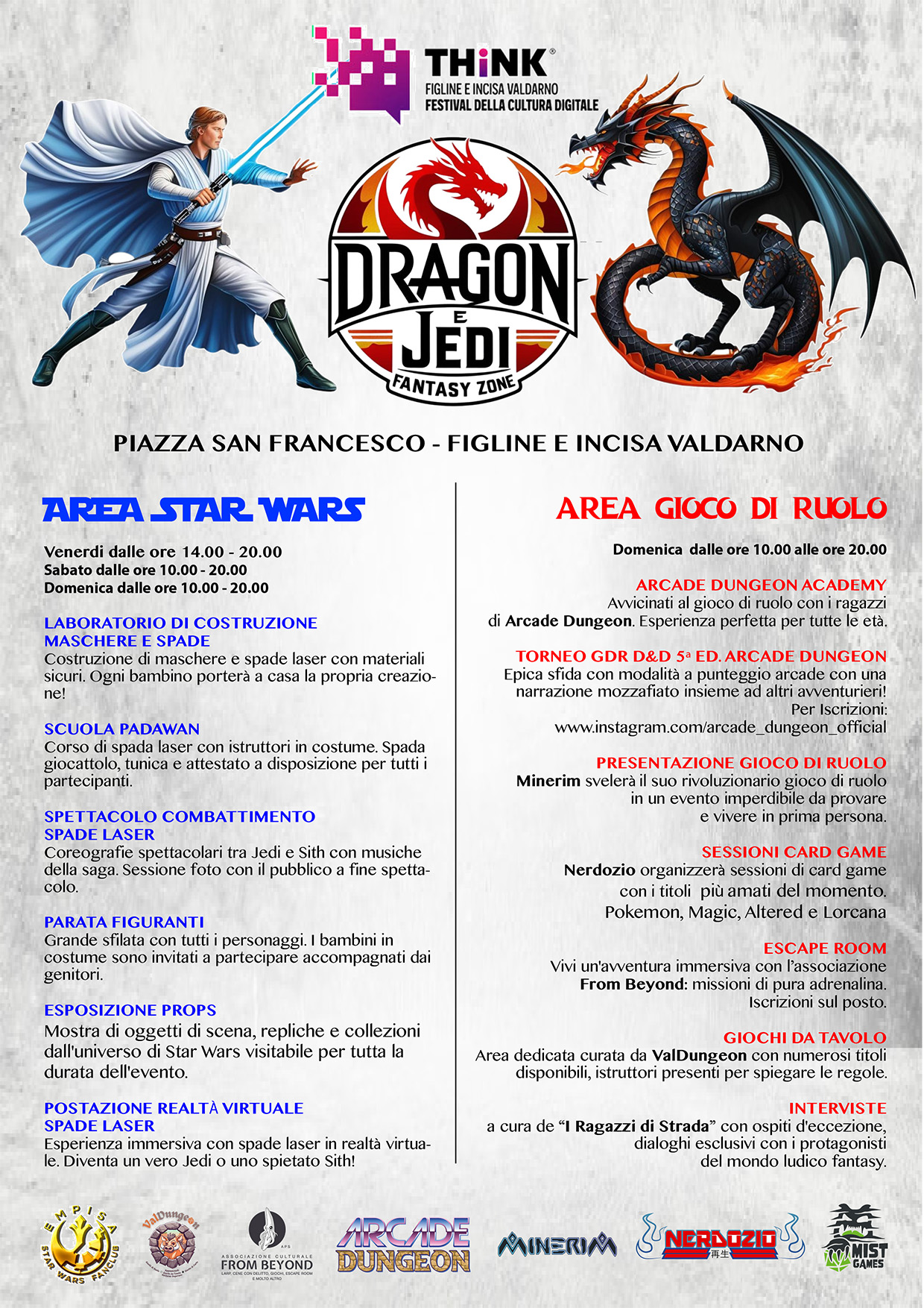 In Piazza San Francesco invece ci saranno dimostrazioni dei robot dell’Isis Valdarno di San Giovanni Valdarno, un’area dedicata a Star Wars per grandi e piccini e un’area interamente dedicata ai giochi di ruolo (quest’ultima solo domenica 18 maggio). Nel Palazzo Pretorio invece sarà riprodotta una sala giochi anni ’80 e ospitata la mostra "Back To The Digital", che si propone di guidare il visitatore attraverso il più significativo cambiamento tecnologico e culturale della nostra epoca: il passaggio dall'analogico al digitale, attraverso un percorso immersivo e interattivo in cui si racconta di come questa rivoluzione ha trasformato non solo il nostro modo di vivere, ma anche di creare, conservare e condividere la cultura. Nella Sala Sarri, inoltre, sarà possibile sperimentare un’Escape room ispirata alla saga “Ritorno al Futuro”. Obiettivo? Aiutare Doc Brown a risolvere un problema con la Delorean (che sarà realmente presente davanti al Palazzo, durante la tre giorni) e per uscire, quindi, dalla stanza, risolvendo enigmi e usando la logica.