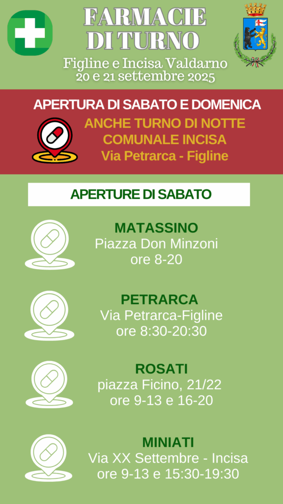 Ecco di seguito le farmacie di turno aperte il fine settimana del 20 e 21 settembre a Figline e Incisa Valdarno.