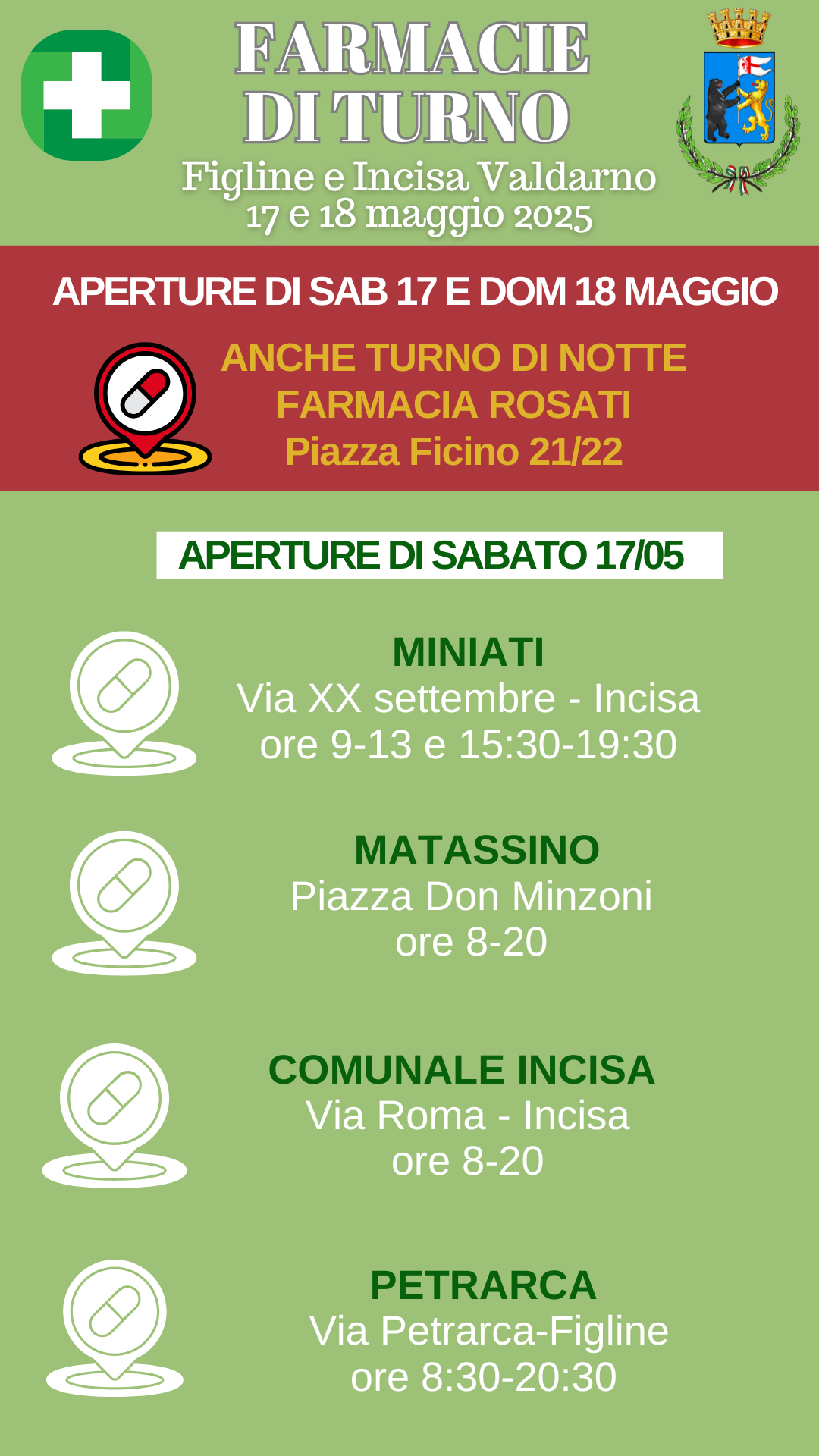 Ecco di seguito le farmacie di turno aperte il prossimo fine settimana a Figline e Incisa Valdarno.