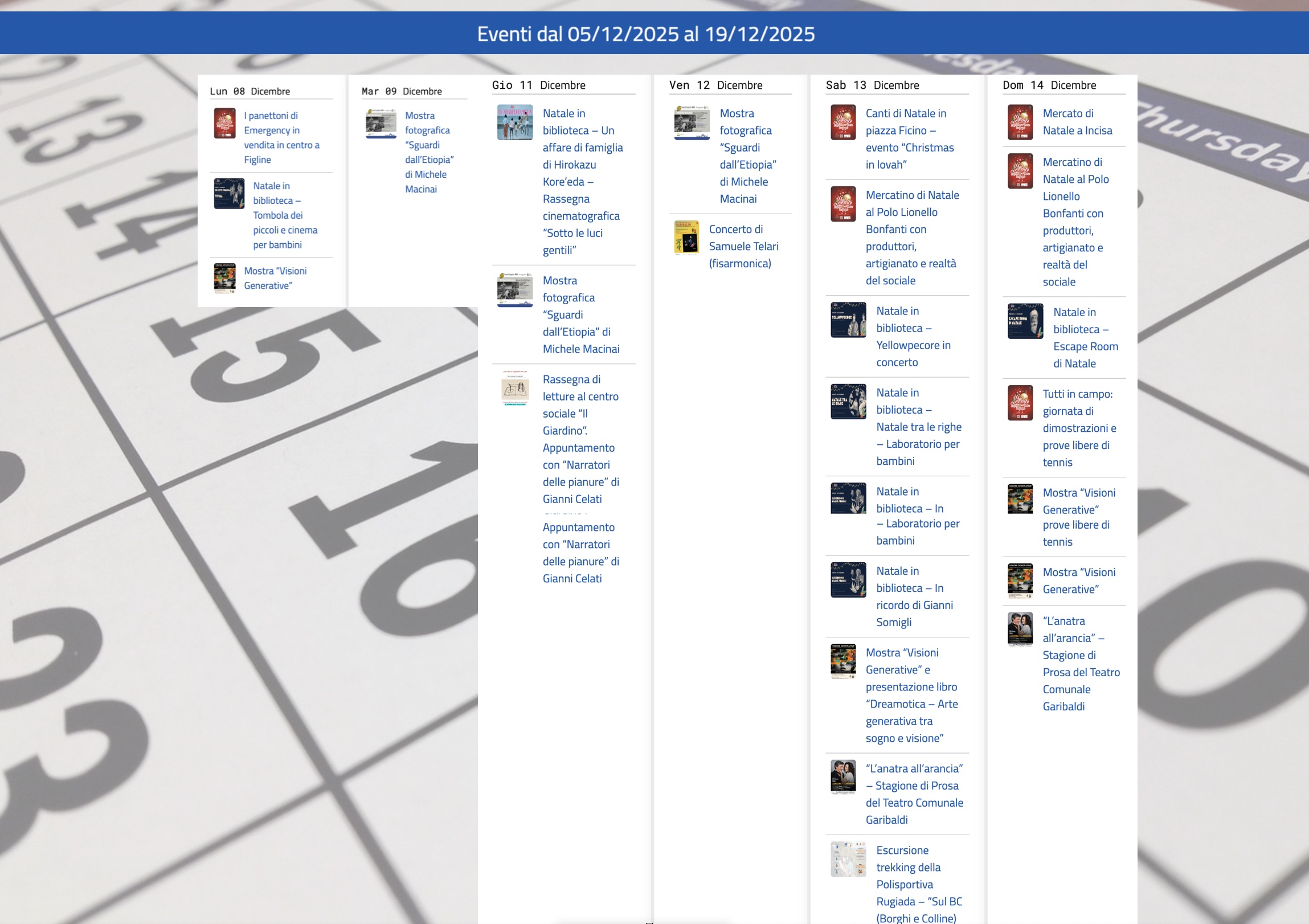 Nel fine settimana tanti appuntamenti dedicati al Natale e non solo. Sabato 13 dicembre si terrà l'escursione trekking della Polisportiva Rugiada, aperta a tutti coloro che amano le camminate, con ritrovo ai giardini Nano Campeggi di Bagno a Ripoli alle 9,30 (prenotazione obbligatoria entro l’11 dicembre al 3202616045 o alla mail info@polisrugiada.org). Il pomeriggio, alle 16, in piazza Marsilio Ficino sarà possibile assistere ai canti di Natale “Christmas in Lovah”, un’esibizione dell’Associazione Paro Paro in favore di Andos Valdarno, mentre al Polo Lionello Bonfanti di Burchio - Incisa, dalle 10,30 alle 19,30, è in programma un mercatino con produttori, artigianato e realtà del sociale a cura di Salve! Health to share odv. L’appuntamento, ribattezzato “Erba Brusca del Burchio”, si ripeterà, nella stessa fascia oraria, anche domenica 14 dicembre.Per la rassegna “Natale in biblioteca” sono invece previsti 4 appuntamenti, tra sabato e domenica, divisi tra la biblioteca Rovai di Incisa e la Marsilio Ficino di Figline. Alla biblioteca Rovai, alle 10 di sabato 13 dicembre, si svolgerà il laboratorio per bambini “Natale tra le righe”, una mattina di letture e creatività per accogliere l’atmosfera del Natale, con la realizzazione finale di un’opera con materiali di recupero. Successivamente, alle 11,30, verrà assegnato un piccolo riconoscimento dedicato ai giovani lettori più appassionati, voluto dalla famiglia di Gianni Somigli per ricordare lo scrittore incisano scomparso nel 2023.