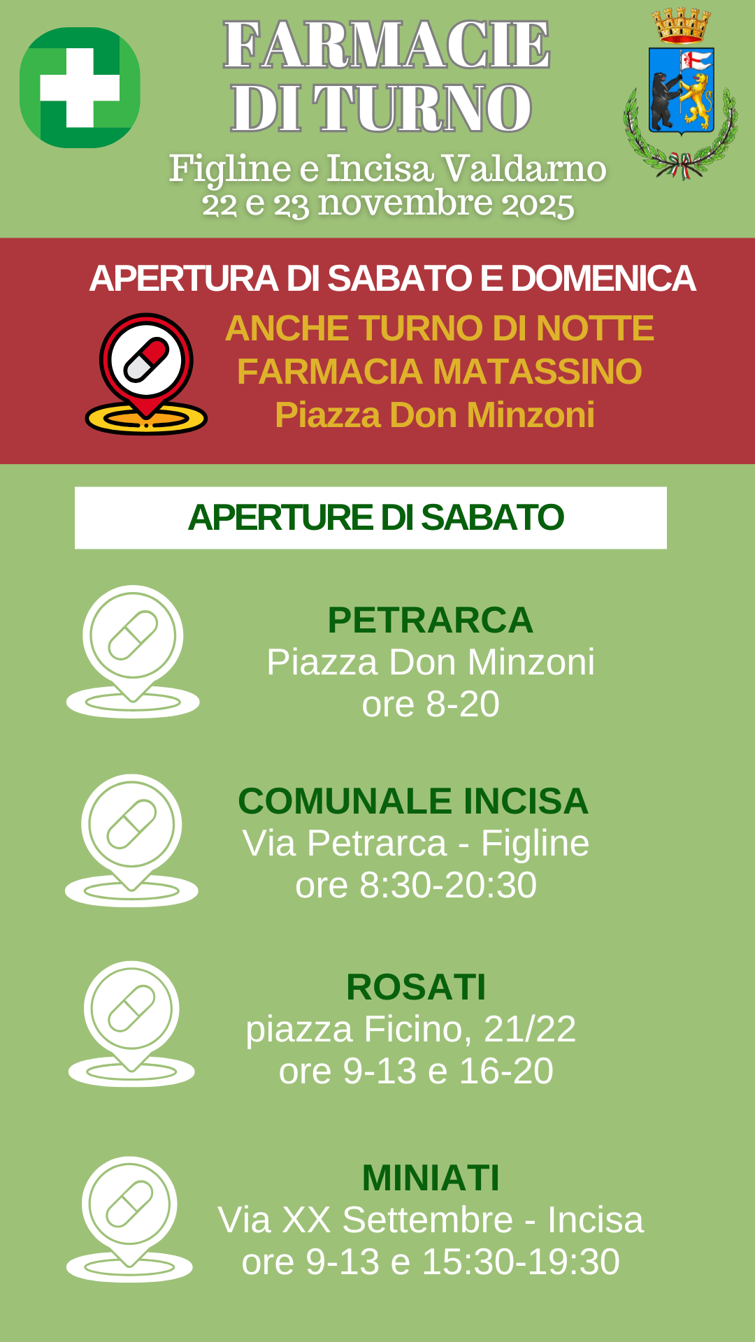 Ecco di seguito le farmacie di turno aperte il fine settimana del 22 e 23 novembre a Figline e Incisa Valdarno.