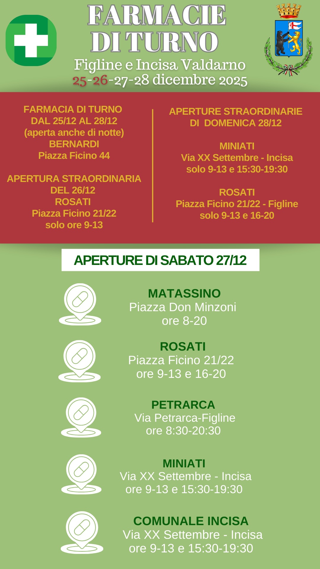 Ecco di seguito le farmacie di turno aperte nella settimana natalizia, da giovedì 25 dicembre a domenica 28 dicembre a Figline e Incisa Valdarno.