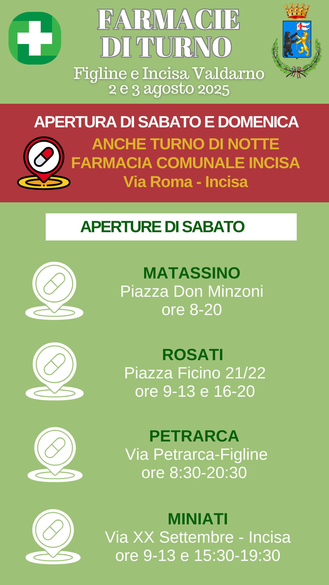 Ecco di seguito le farmacie di turno aperte il prossimo fine settimana a Figline e Incisa Valdarno.