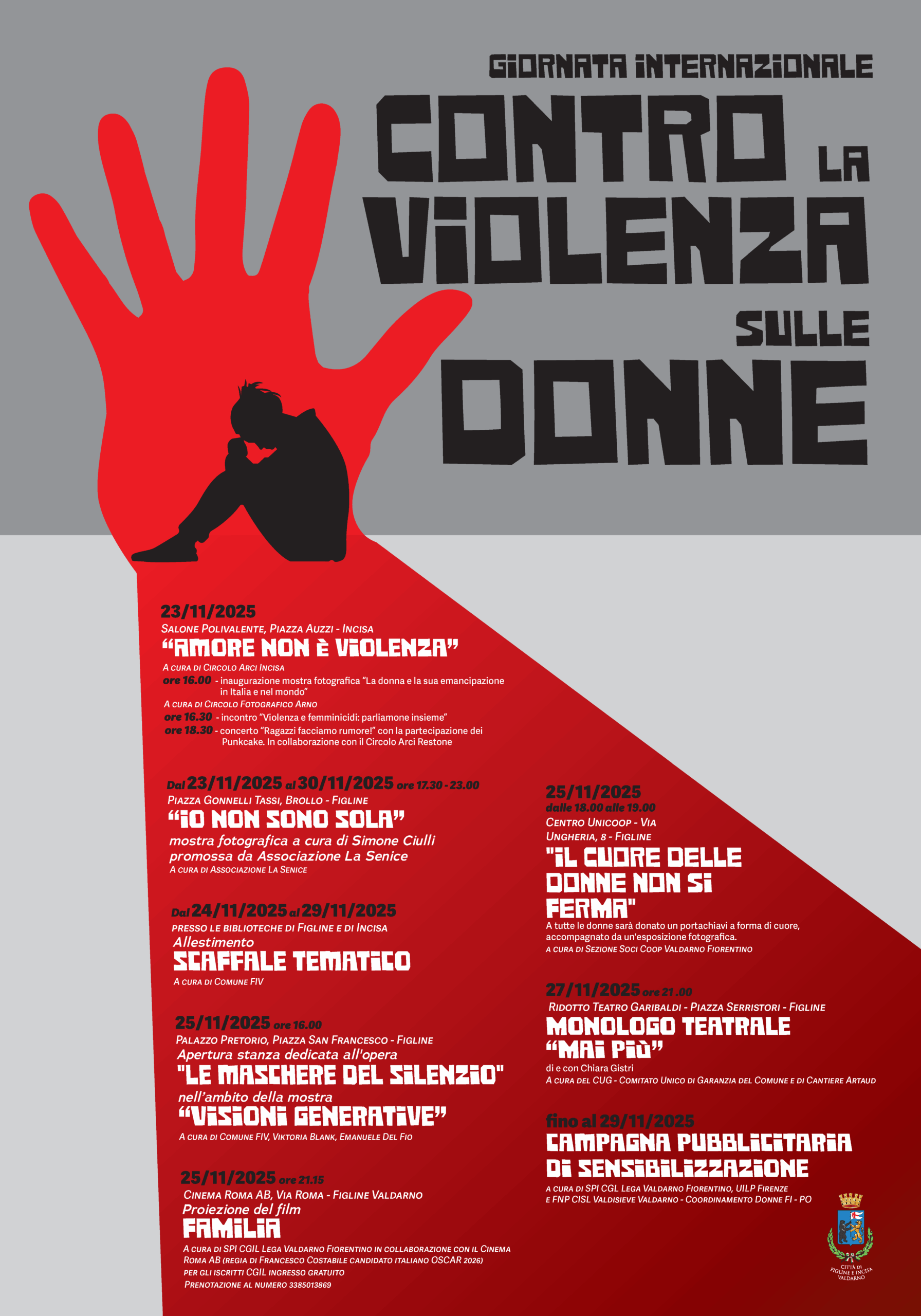 Dal 24 al 27 novembre, inoltre, le biblioteche comunali di Figline e Incisa allestiranno uno scaffale nel quale saranno presenti libri che affrontano la tematica della violenza sulle donne.