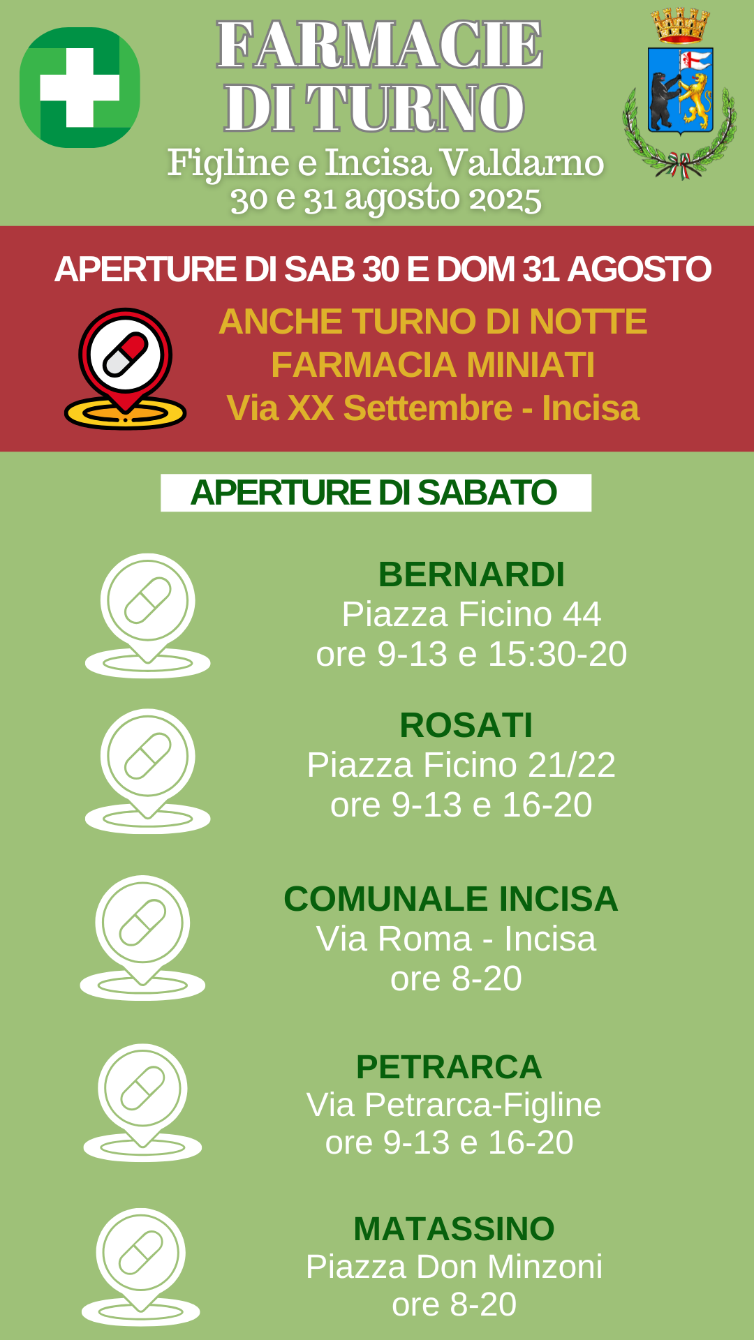 Ecco di seguito le farmacie di turno aperte il fine settimana del 30 e 31 agosto a Figline e Incisa Valdarno.