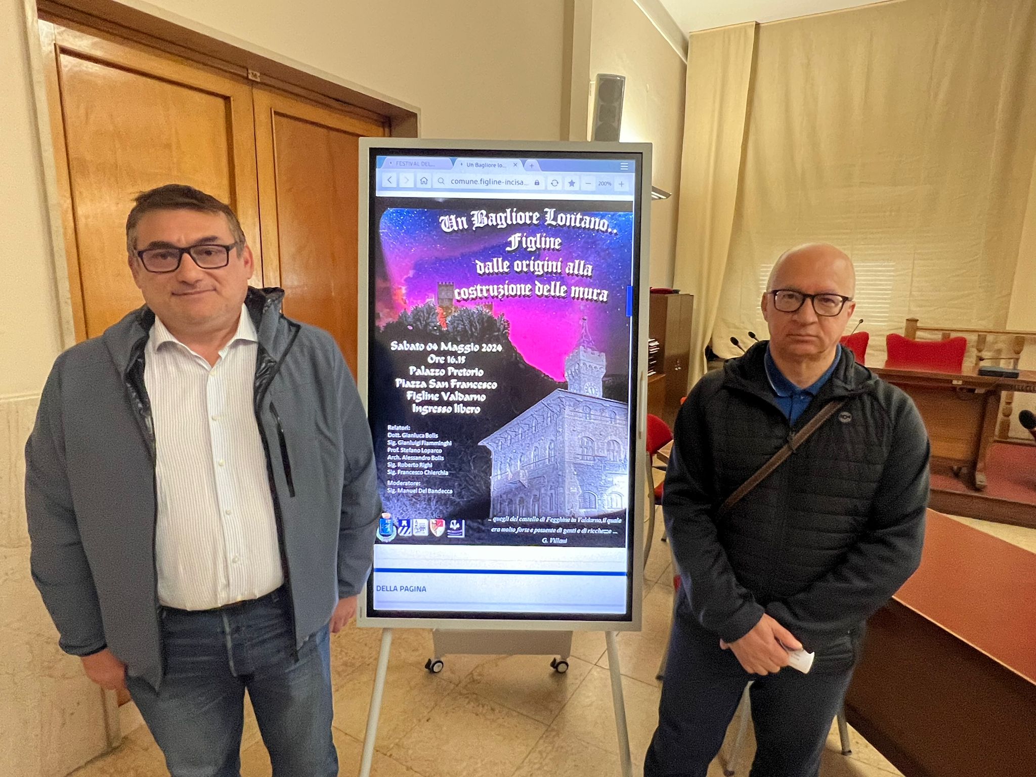 Foto in gallery: Palazzo Pretorio, gli organizzatori Gianluigi Fiamminghi e Italo Romano e la locandina dell'evento.