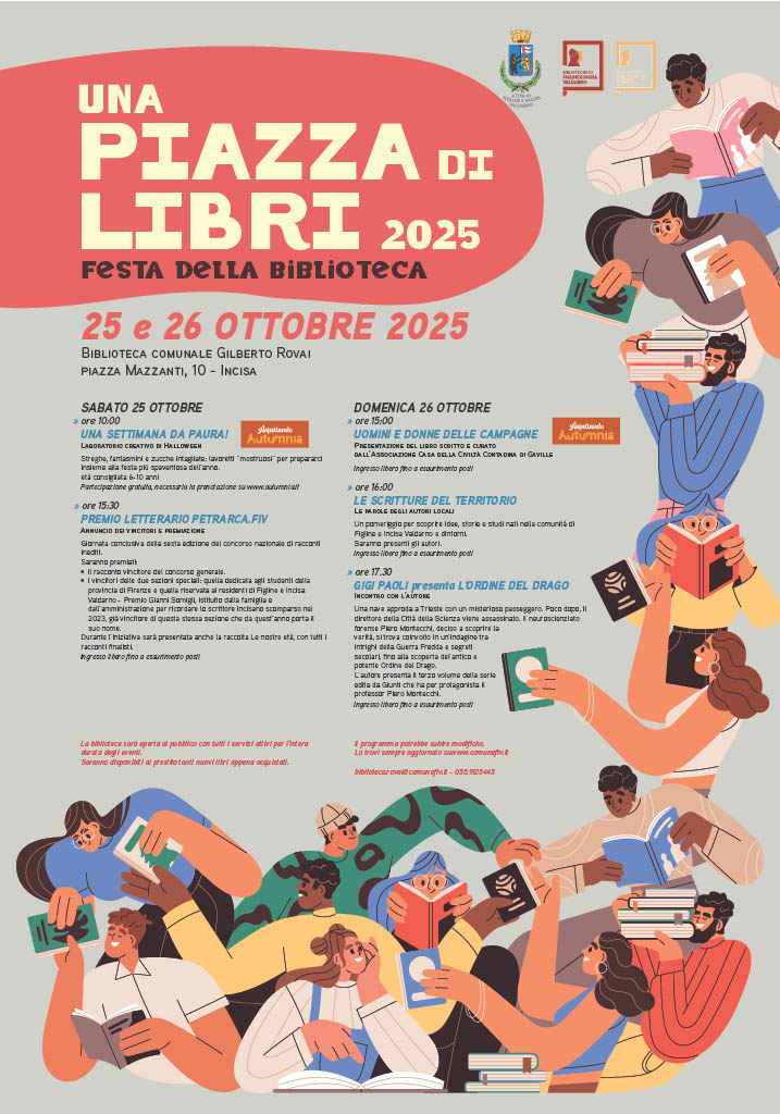 Ogni storia ha il potere di cambiare chi la ascolta. È da questo potere che nasce “Una piazza di libri”, la festa della Biblioteca comunale “Gilberto Rovai” di Incisa, che sabato 25 e domenica 26 ottobre aprirà le porte alla sesta edizione della manifestazione, con incontri aperti a tutta la comunità per ascoltare parole che ci parlano del presente, del passato e di ciò che ancora deve essere scritto. Due intense giornate dedicate al piacere di leggere, ascoltare e condividere, con un programma che spazia dai laboratori per bambini agli incontri con scrittori, dalla premiazione del concorso letterario locale alla presentazione di opere che raccontano il territorio ed i suoi protagonisti.